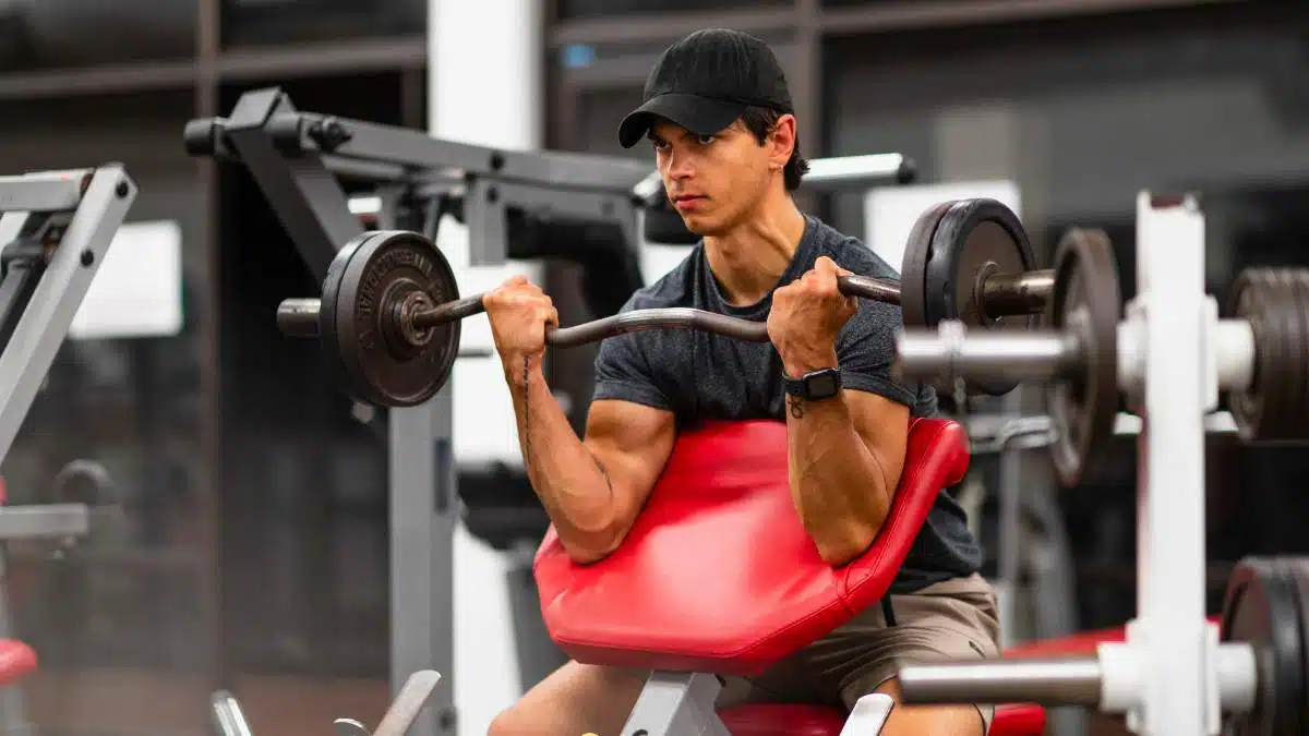 2. Uginanie ramion ze sztangą łamaną na modlitewniku: Ćwiczenie izolujące biceps, pozwalające na skoncentrowanie się na pracy mięśnia.